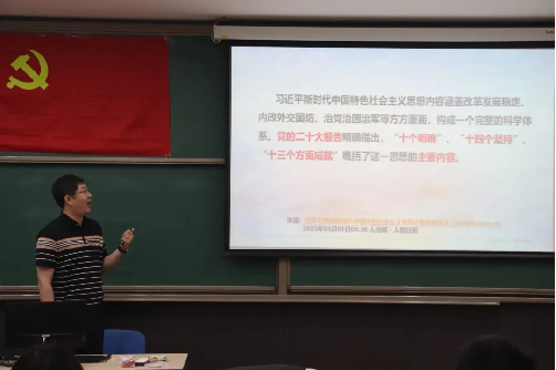 邓岩对“十个明确”、“十四个坚持”、“十三个方面成就”展开具体内容讲解,带领党员深刻领悟习近平新时代中国特色社会主义思想内涵,要求全体党员结合学习生活实际,学好用好习近平新时代中国特色社会主义思想的世界观和方法论。