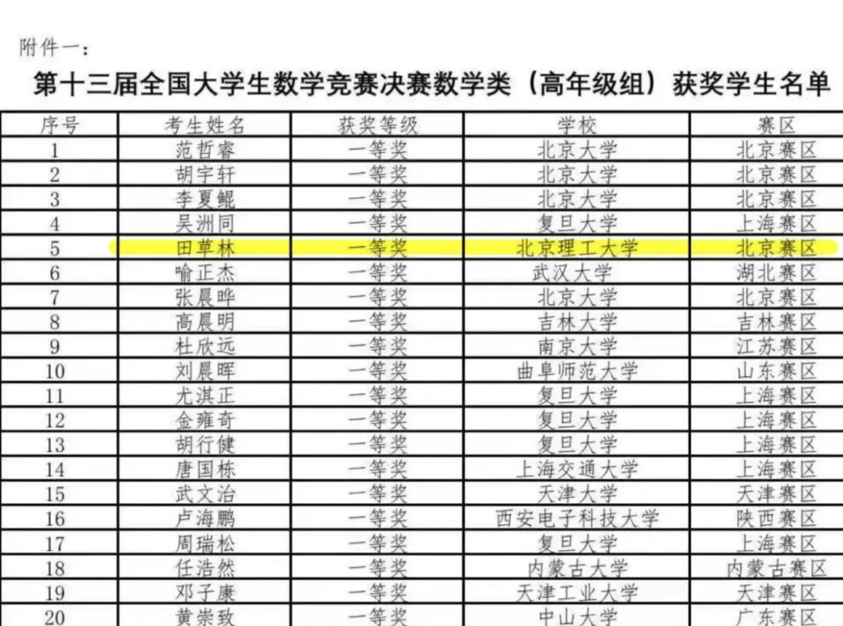 经逐层选拔、激烈角逐,求是1908班数学与应用数学专业田草林同学斩获全国大学生数学竞赛决赛数学类(高年级组)全国一等奖!位列全国第五名!取得了书院学生在该项赛事的最佳参赛成绩!祝贺获奖同学!